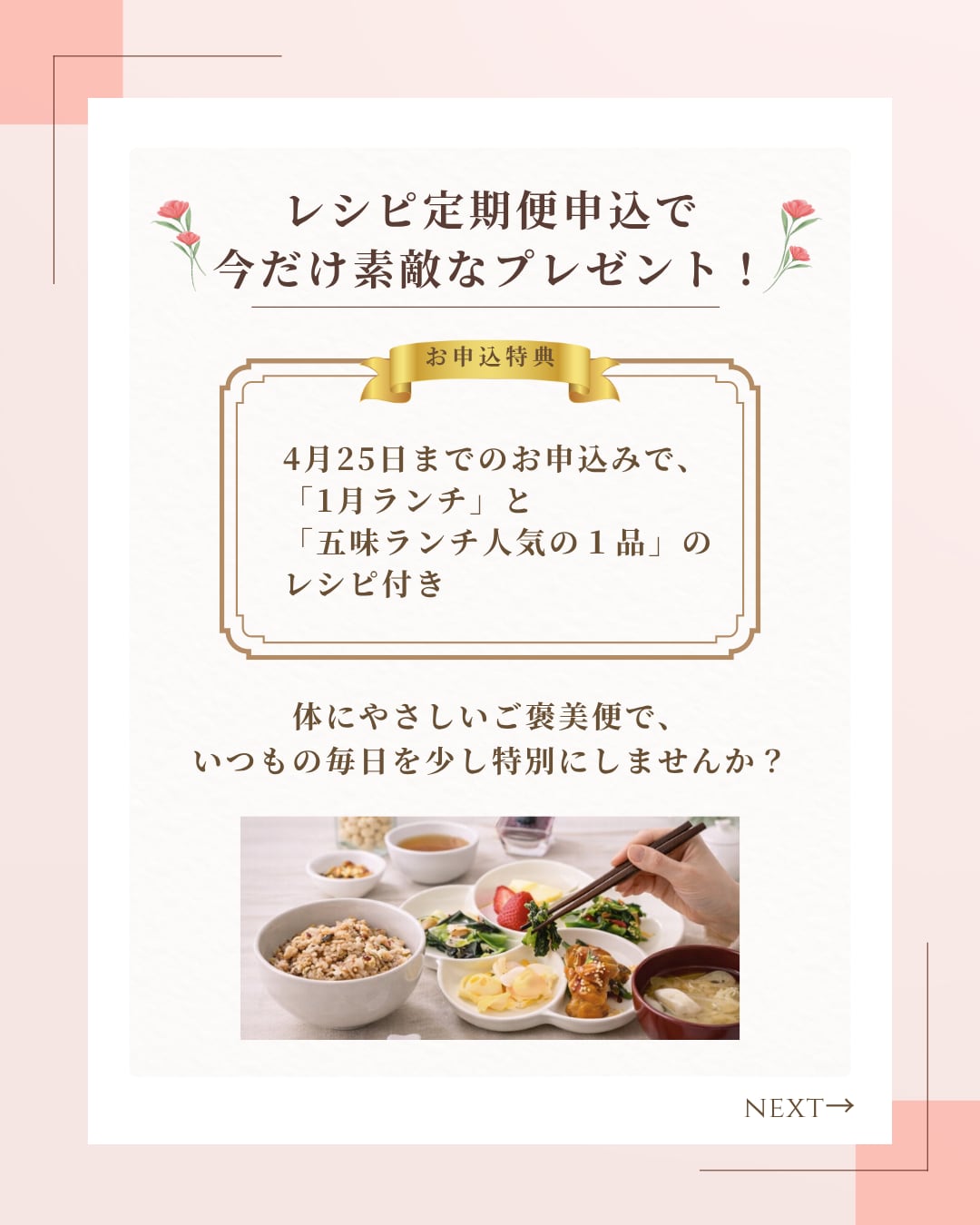 ◇申込特典:4月25日までの申込で【月替わりランチ全て】&【五味ランチ人気の1品】レシピを特別公開♪